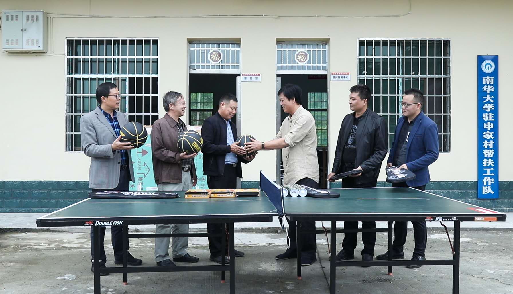 潘本衡一行不顾远途劳累,刚抵达申家村,便将2台乒乓桌的4件组装件搬下车,谭志刚与体育学院运训教研室主任贺仕刚示范安装好了1台乒乓球桌。随后,谭志刚把3个篮球、4副羽毛球拍、4副乒乓球拍等仪器交给村主任康佑兵。看着这些从衡阳来到申家村的高端器材,康佑兵激动地握着谭志刚的手连声道谢。为检验球桌的性能,潘本衡与康佑兵当即来了一场友谊赛,一来一回间,二人打的十分开心,现场不时响起快乐的笑声,真正的做到了南华——申家一家亲。