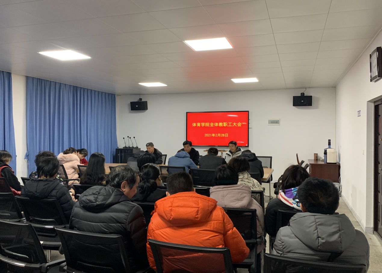 2月28日上午,体育学院在二楼会议室召开新学期全体教职工大会,布置开学工作。会议由学院党总支书记、院长谭志刚主持。全体教职工参加了会议。