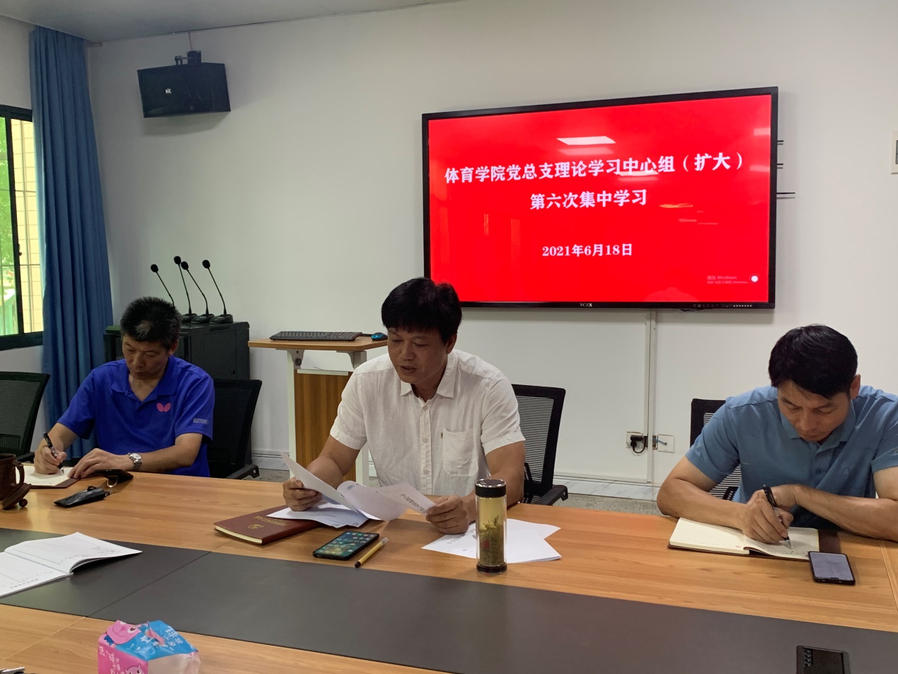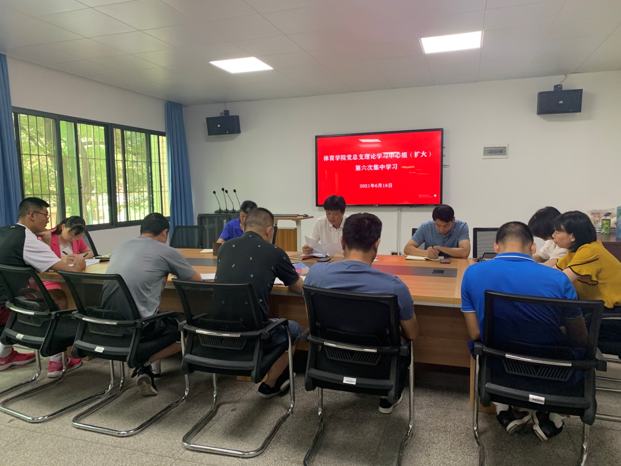 6月18日下午,体育学院党总支理论学习中心组在学院二楼会议室开展党史教育“学史力行”专题学习,原原本本学原文、读党史,做到带头学、带头悟,扎实推进党史学习教育。学院领导班子成员、各科室正、副主任参加了学习活动。学习活动由党总支书记、院长谭志刚主持。