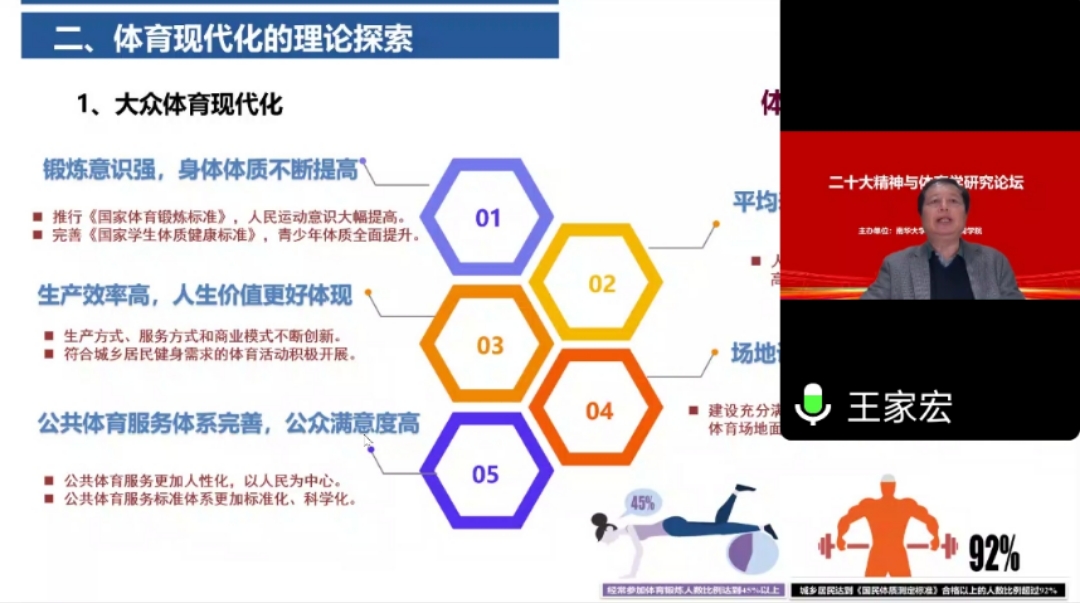 王家宏教授以《中国式体育现代化与健康中国建设研究》为题,从党的二十大报告中明确提出要“促进群众体育和竞技体育全面发展,加快建设体育强国”切入,讲述了体育在建设社会主义现代化强国新征程中的重要作用,阐述了体育现代化与社会现代化的互动关系,概括了健康中国建设的重点领域。