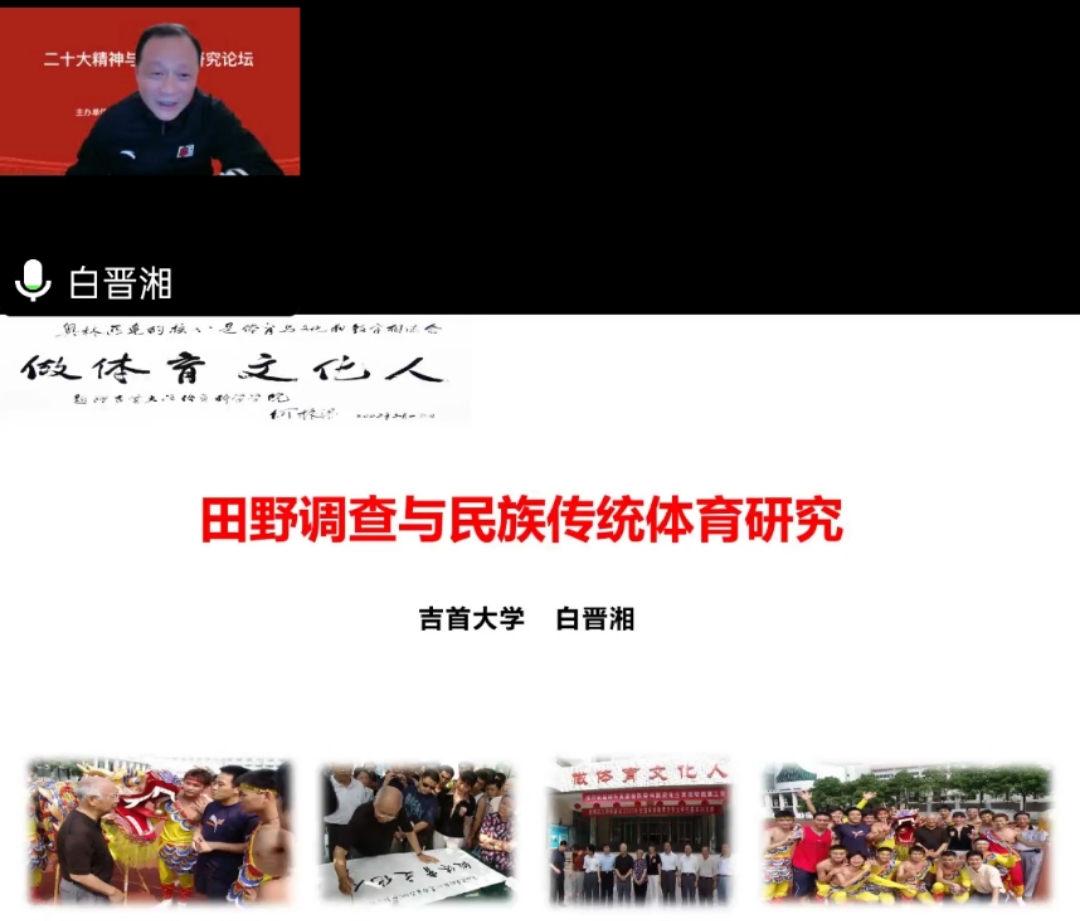 白晋湘教授以《田野调查与民族传统体育研究》为题结合自己的亲身经历,深入浅出讲解了田野调查方法以及如何选择田野调查的主题及研究,为我们更好地做好英国正版365官方网站提供了重要的启示和借鉴。