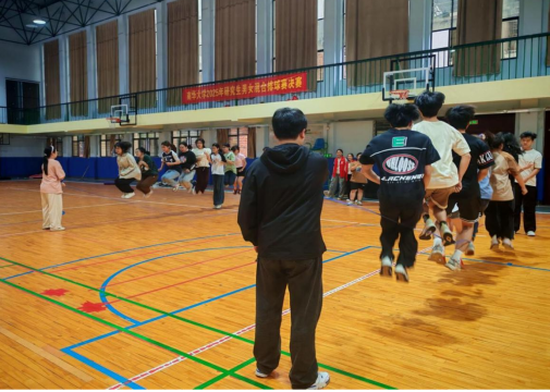 北校区田径场风雨跑道上,2024级50米×20人接力竞速赛如箭在弦。参赛队员两列纵队严阵以待,手握跳绳如握青春画笔,在疾驰中勾勒协作的弧线。康复班队员以“零失误交接”展现超凡默契,最终以4分06秒的成绩摘得桂冠;南校区体育馆内,2023级集体跳大绳比赛化作灵动的舞蹈,摇绳者稳如磐石把控节奏,跳绳者轻盈穿越如飞燕掠水,2307班以95次成功跳跃的佳绩登顶,每一次腾空都定格为团队协作的最佳注脚。