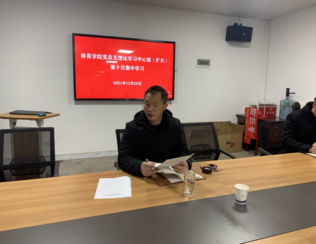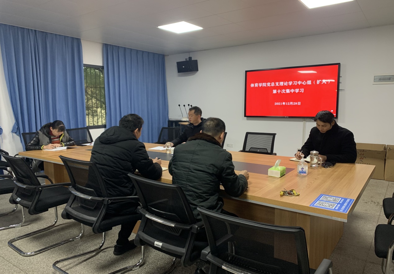 12月28日上午,体育学院党总支理论学习中心组(扩大)在学院二楼会议室专题学习了党的十九届六中全会精神。学院领导班子成员、党政办公室参加了学习活动。学习活动由党总支书记黄坤荣主持。