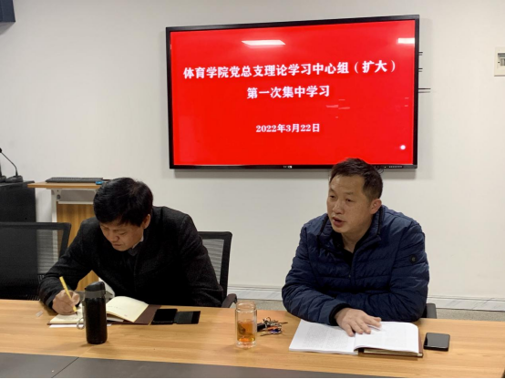 3月22日上午,体育学院党总支理论学习中心组(扩大)开展第一次学习,集中学习全国“两会”精神。会议强调,全院上下要认真学习贯彻落实全国“两会”精神,把思想和行动统一到习近平总书记重要讲话精神上来,进一步增强“四个意识”、坚定“四个自信”、做到“两个维护”,落实立德树人根本任务,努力实现学院高质量发展,以实际行动迎接党的二十大胜利召开。学习活动由党总支书记黄坤荣主持。