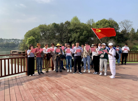 在党史馆前的南湖边,在一艘按原样仿制嘉兴南湖的红船前,全体教师党员共同朗诵了红色诗词《红船,从南湖起航》,向一代又一代为实现中华民族伟大复兴而拼搏奋斗的领航人、护航人致以崇高的敬意。