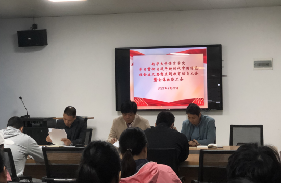 2023年4曰28日上午,体育学院党总支在全院组织召开学习贯彻习近平新时代中国特色社会主义思想主题教育动员大会暨全体教职工会议,院长谭志刚、副院长杨栋、副院长陈志凌分别发言,会议由副院长杨栋主持。
