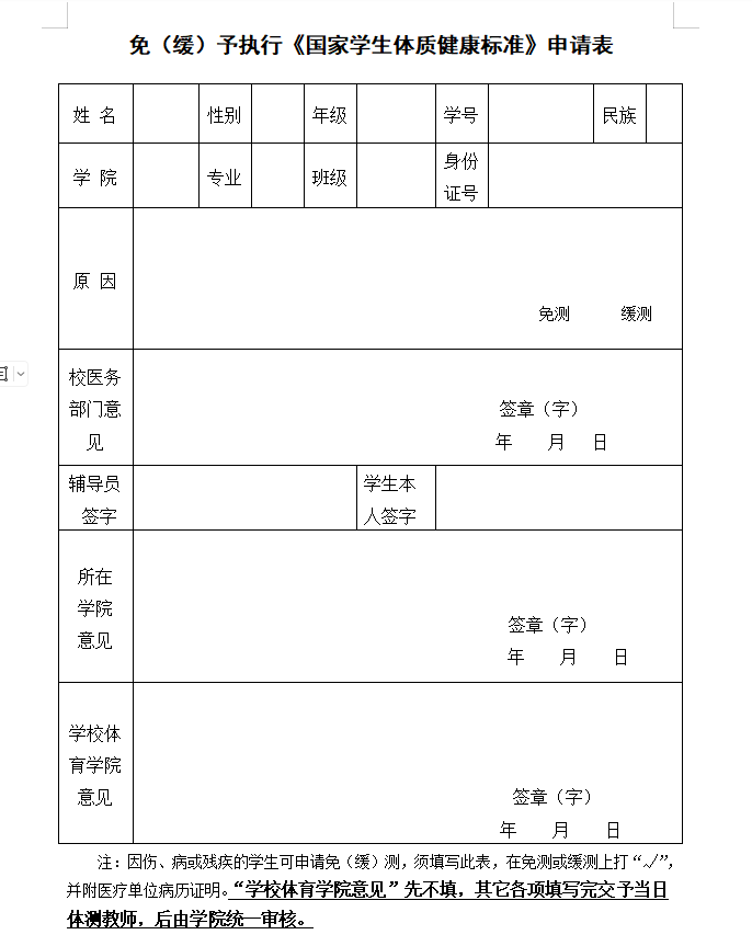 免(缓)予执行《国家学生体质健康标准》申请表
